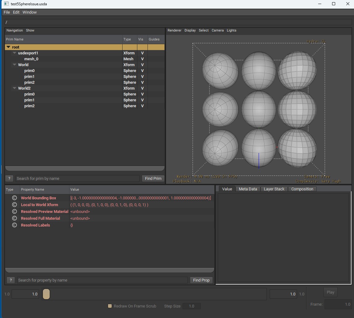 Below you see a USD stack of spheres, unit 1 radius (default), default position - note the gap.