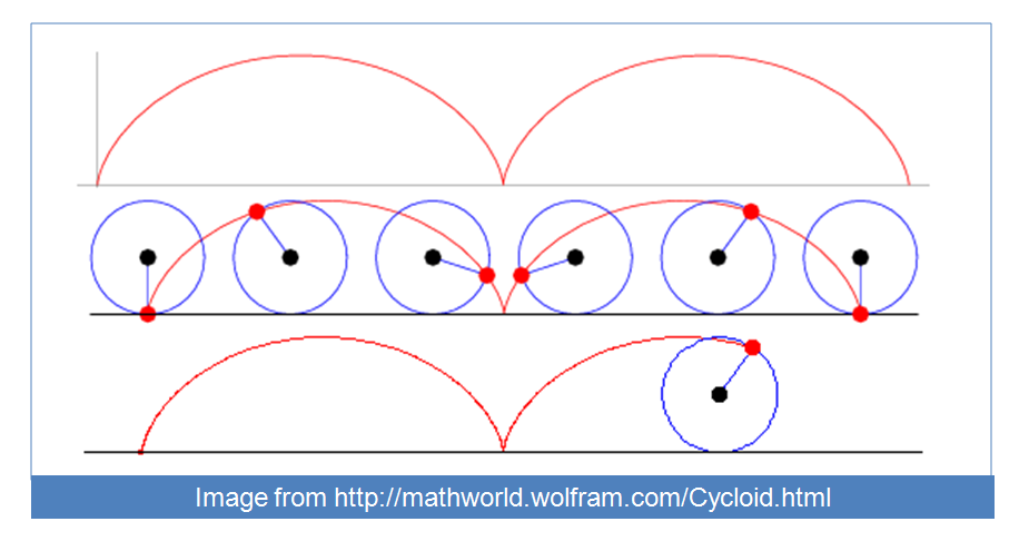 The velocity of each circle speeds up and slows down according to a cycloid (rim of the circle rolling along a line). (Galileo 1599)