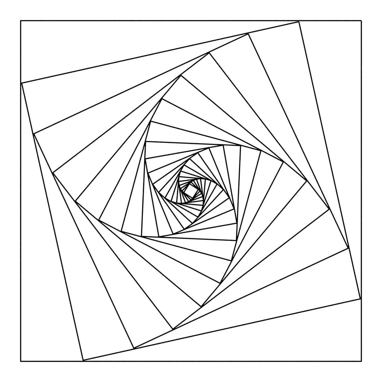 What is you were to use Python and Turtle Graphics? The same approach can be used. It is imperative that you use the shrinking rather than growing if you want filled squares as in turtle we are using a 2D tkinter window. Here are the same equations used in turtle graphics and python. The first one is 20 iterations, rotated 12.5 degrees and shrinking with pow(1/1.2,i). The second is 44 squares, rotation 6.05 degrees and scaling 1/1.1. The final one is with a smaller rotation, slower shrink rate and less rotation (70,1/1.05,3.125) and finally the same equation but iterating 20 times instead..