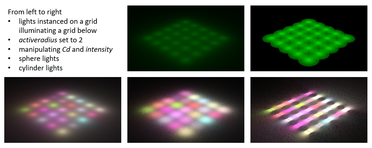 Copies of lights - really is just an instance node. One thing I find quite confusing is that in the geometry (sops) context, "copy to points" copies the item on the left onto the source points of the item on the right. However, if you are in LOPS, copy to points is really a "instancer" node. Why SideFX provided the label "copy to points" I'm not certain. The node does not behave with the same logic as the sops context and the inputs are the opposite of what they are in sops. It would be helpful to be able to turn off the icon for the light (haven't found a way to do that yet).