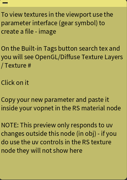 If you want to see textures in your viewport you can with a few easy steps. Note this preview will only show uv changes at sop level, not on the rstexture node, but still can be useful. Instructions are given in the above file: