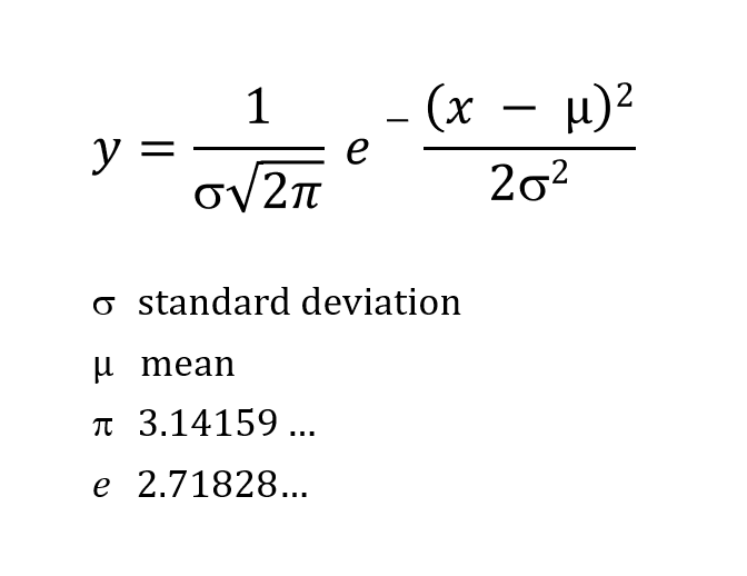 Note the above formula expands to y = 1/(σ * √ 2*π ) * e - ( (x - μ)2 / 2 * σ2 )