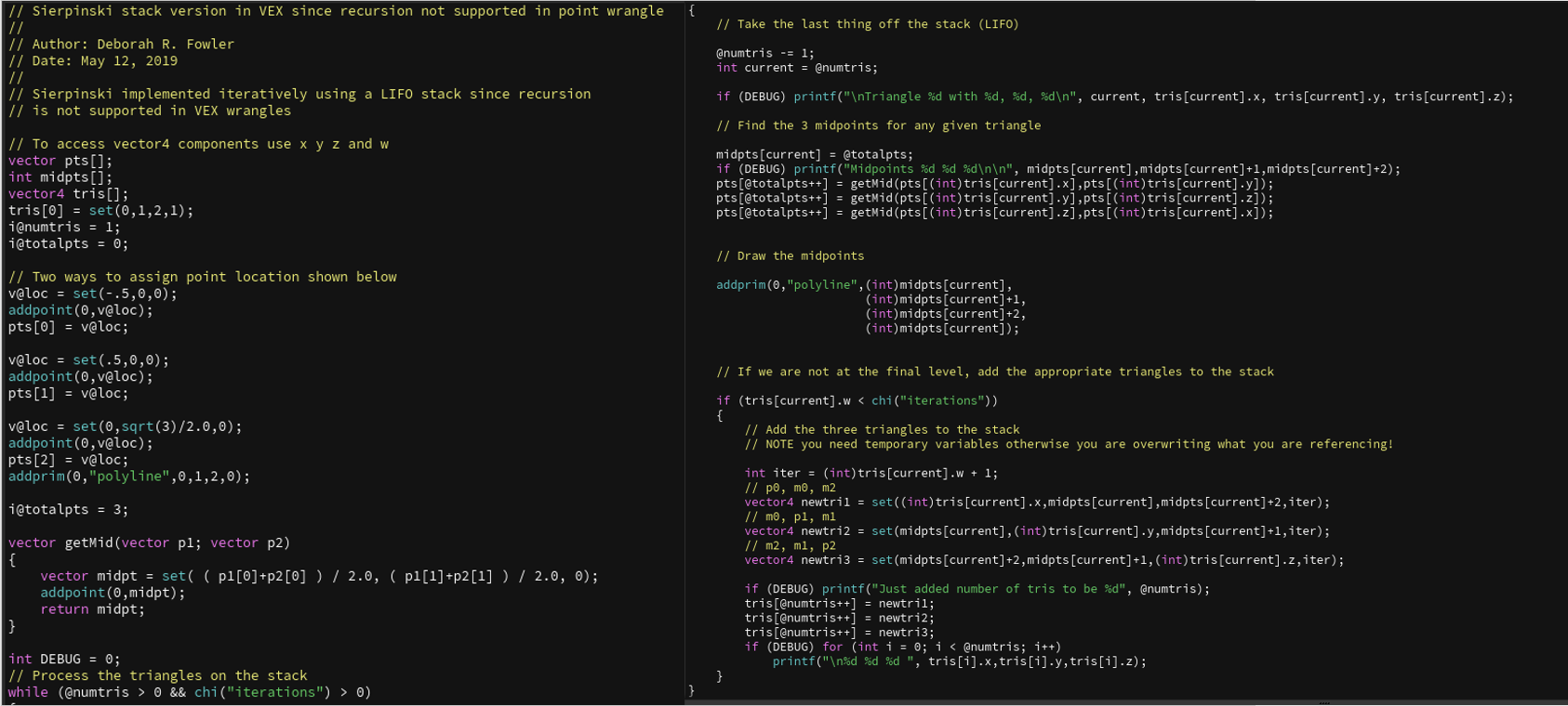 Sierpinski Triangle in a single point wrangle node in Houdini. I