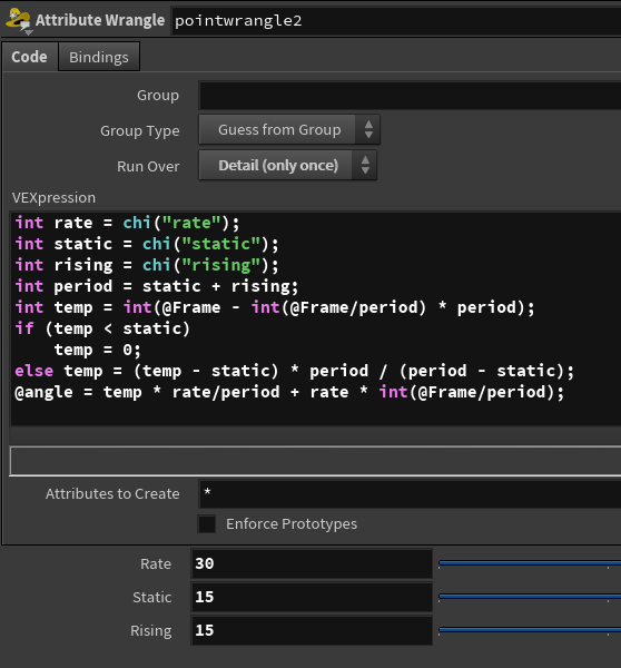 Suppose we call the frame range where it is horizontal static and the sloped part rising. It can be determined that this graph can be created using the following code — either a point wrangle or hscript as pictured below — to achieve the animation seen in the gif. The variable rate is how many degrees it spins during the sloped phase. In this example, 15 frames are static and 15 frames are rising. The reason both are set to 15 is because of the speed of the mechanism coming down with the cookie layers.